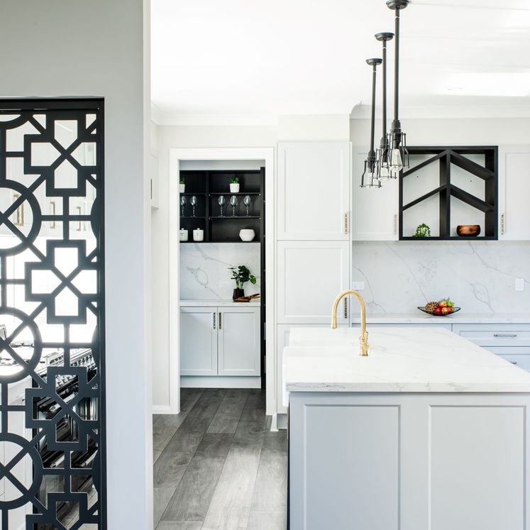 Focusing on the finer details within the light fixtures and the joinery, patterns emerge throughout the home tying each of the spaces together. A custom made privacy screen built in to a niche in the kitchen creates the perfect partial screen while allowing full visibility of the kids playing in their toy room while mum's cooking in the kitchen.
